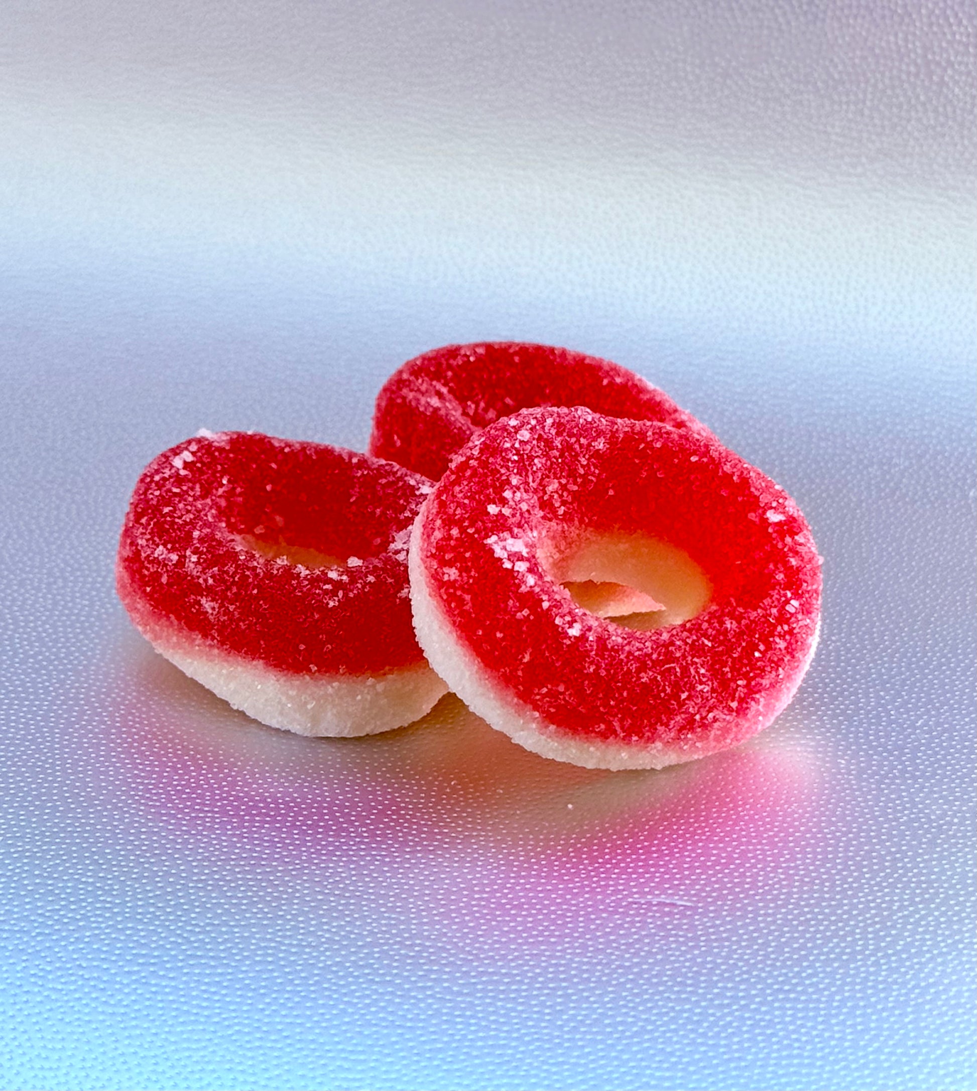 المكونات: شراب الذرة، السكر، نشا الذرة، جيلاتين لحم البقر، المواد الحمضية (حمض الستريك، حمض الطرطريك، حمض الماليك)، نكهة اصطناعية، اللون (أحمر رقم 4).