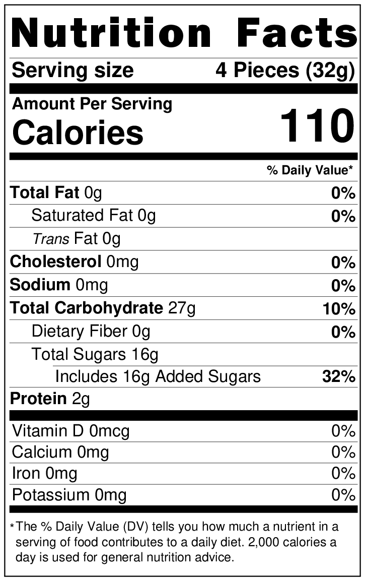 المكونات: شراب الذرة، السكر، جيلاتين لحم البقر، حمض الستريك، زيت النخيل، النكهات الاصطناعية، شمع الكارنوبا، شمع العسل، الألوان (أحمر رقم 40، أصفر رقم 5، أصفر رقم 6، أزرق رقم 1).